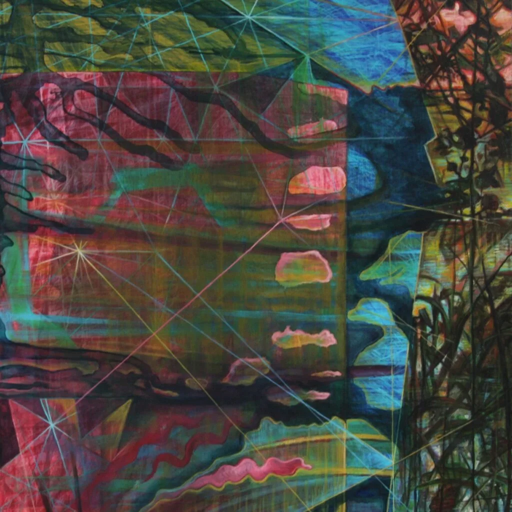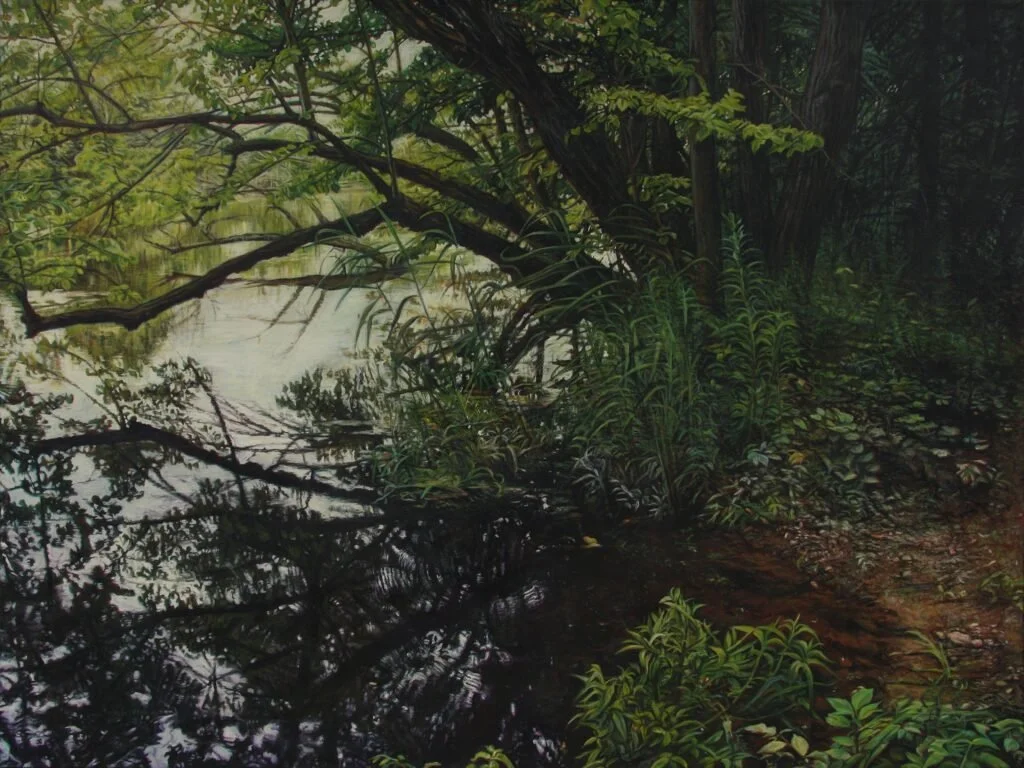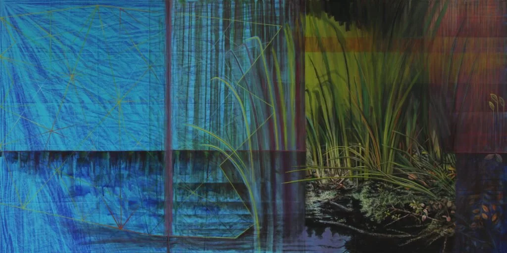 Shifting River Ways feature paintings that explore multiple shifts in the life of the river close to my home. The paintings shift through the combination of alternating and mingling different processes and images that sometimes abruptly change or subtly transition through the diptych. The long horizontal structures visually and physically remind one of traversing landscape. My husband and I walk the East River trail frequently and notice that over the last years our beloved river and trail are being destroyed through a combination of erosion, agricultural runoff, extreme rainfall, and flood damage.
