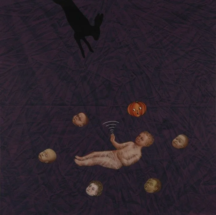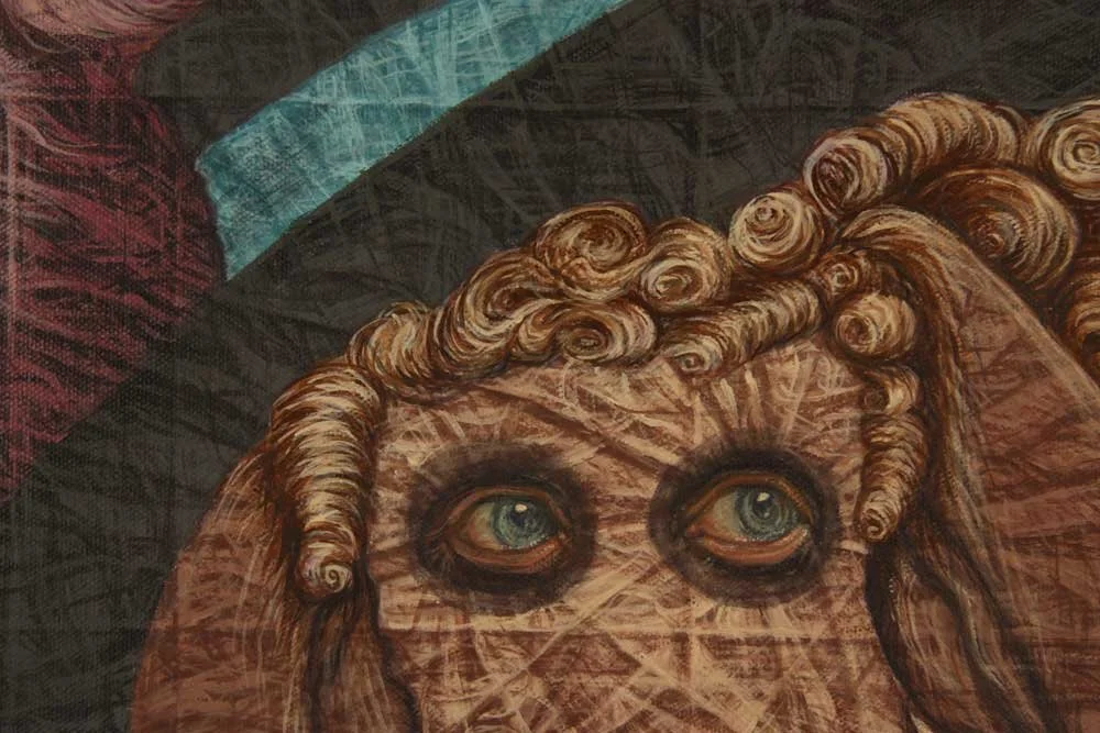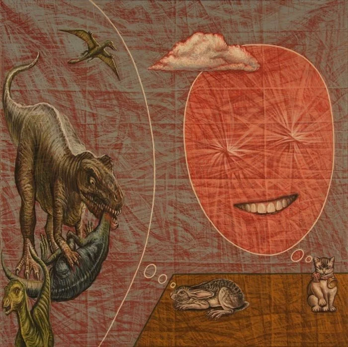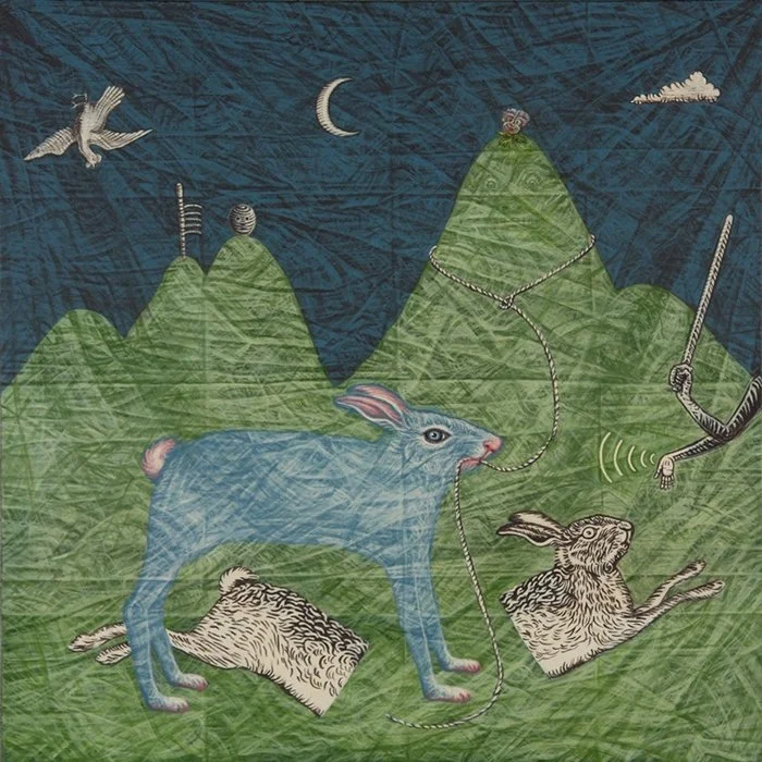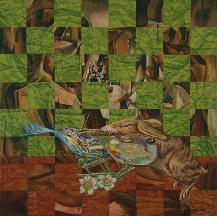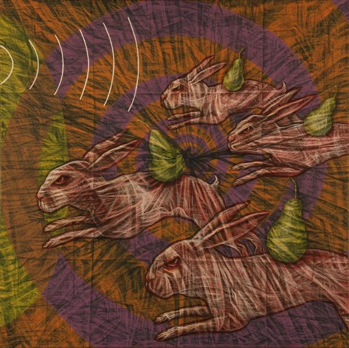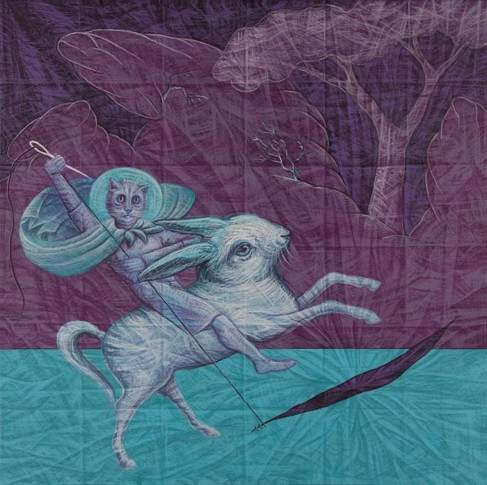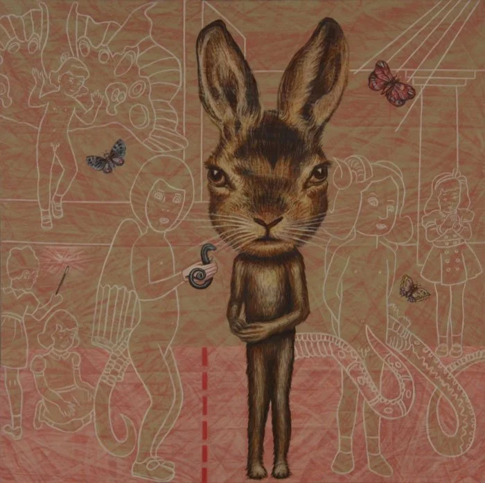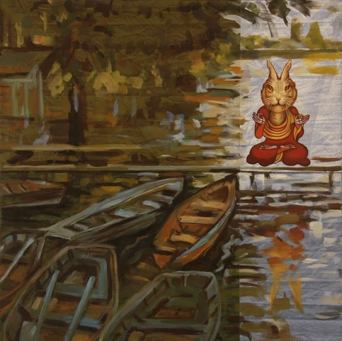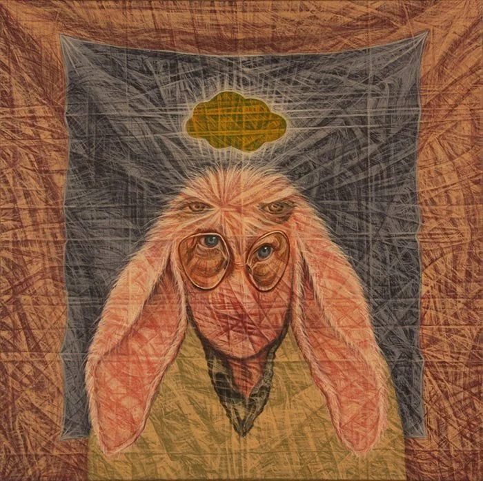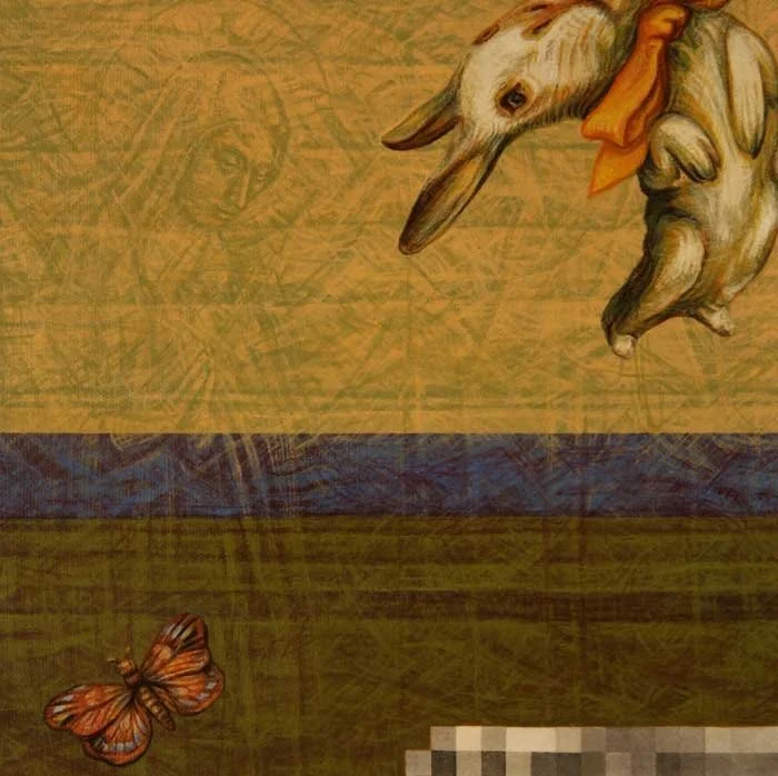 Each painting in my recent Through the Veil series begins with a rendering from a closely observed fabric with wrinkles and folds. They recapitulate the compositional structure of a painting/drawing by artists from the past and present. The fabric in these paintings acts as a limen or threshold that places the viewer into multiple, often conflicting, layers of space and meaning. In the series the Rabbit or environment may be stretched or manipulated through Photoshop to create a sense of instability, heightened emotion, or a digital sifting. The paintings good-humoredly deconstruct imagery from pop, outsider, and high culture to create new “spaces” of meaning. The shape-shifting Rabbit is positioned in front of or behind; it looks into, out, around or between images and spaces. The paintings use dark humor, visual puns, symbols and metaphors, moments of silence, art historical allusions, cultural collisions, and spiritual conundrums to play with style and pictorial/formal construction.