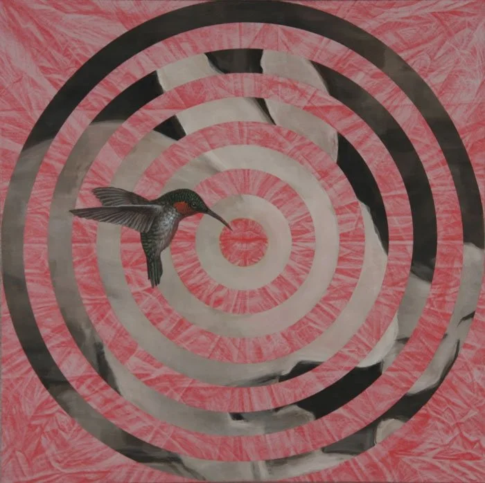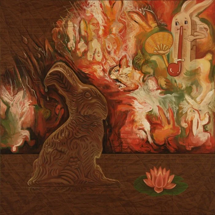 In Targeting Tuyman’s Rabbit the targeted image is a painting of a rabbit seen through a television screen by contemporary Belgian painter Luc Tuyman. A hummingbird from a recent book of science illustration hovers in a forward space and approaches the bull’s eye of the spatially ambiguous target where lips emerge from cloth wrinkles. The hummingbird is both investigator and activator of the silent lips; it conceptually targets the lips/eye of the “text” to reveal multivalent possibilities contained in ambiguously targeted spaces. Unveiling Celaya’s Veil unravels the silence in Enrique Martinez Celaya’s painting The Veil where an unclothed boy lies in a snowy forest while catching a rabbit. The black Rabbit in the upper left of the painting comes from an 18th century silhouette. It flies toward a circle of disembodied Christ-child heads from Renaissance nativity paintings and a 1930’s jack-o-lantern that surround a veiled Fra Angelico Christ Child emitting a sound wave. Similar to Celaya’s work, the painting both acknowledges and cracks open European canonical painting. Is the sound wave a warning, greeting, or SOS? Devouring and Reconstructing Kali reverses the narrative of a 19th-century Indian miniature of Vikramaditya Devoured and Revived by Kali. The Rabbit both emerges from and remains part of the fabric creases while holding a rope tied around a mountain with an embedded Kali face and vintage pansy. Attributes of the goddess Kali (the destroyer) are in the landscape along with an 18th-century woodcut of a rabbit cut in two. The painting uncovers the process of its making through “devouring and reconstructing” images. In Playing Chess with Duchamp abstracted and representational elements emerge from and submerge into the fabric and chessboard. Duchamp’s signature in the lower right corner is backward as is the fluctuating image of Duchamp’s Chess Players, putting the viewer (and rabbit) into a space somewhere behind the painting and fabric. The Rabbit determinedly paints an Easter egg while both are being swept-up by and altered through the chessboard or “game” of the painting. In Front of Piero’s Resurrection translates Piero’s painting into folds and wrinkles that reveal several partial images of the Resurrection. In front of the fabric a Victorian Easter card rabbit morphs as it encounters Ugrasura (the snake demon) who wraps around the back of the painting. The Luca Signorelli cloud with an embedded face hangs over the action. Through Darger’s Eyes takes a section from one of Henry Darger’s Vivian Girls collage/drawings. Selected images outlined in white emerge from the fabric wrinkles that reiterate the compositional structure in Darger’s artwork. The Rabbit (here as Darger) is an amalgamation of one of Darger’s girls and a vintage image of a rabbit. One girl hands Darger a snake (a recently discovered pentimento of a coiled serpent in the hand of a late 16th-century portrait of Queen Elizabeth I). Another girl begins to transform the surrounding fabric with a magic wand. The painting creates a transformative world where his girls have the power to transfigure him. The underlying fabric in Mettre Monet en Abime moves in and out of an image of Monet’s Bathing at La Grenouillere. The painting contains a reflection in water that mirrors the landscape of the original painting with the addition of a hovering “Rabbit Buddha” seated in lotus position and intently staring at the viewer while empty boats waiting at the dock invite passengers (viewers) to take a “voyage.” The Rabbit Buddha is a union of images: a Tang Dynasty ink drawing of Buddha and vintage rabbit head (created from a mirror image of the rabbit’s profile). This “light” romp through internal mirroring or mise en abyme presents “undecidable” options among a series of determinate constructions. See Brown depicts a melting chocolate rabbit in front of a backdrop that includes a 1940’s Valentines Day cartoon of a phallic-looking thermometer changing into a rabbit among numerous copulating rabbits. The rabbits and abstract expressionist facture of the backdrop comically allude to the eroticism in Cecily Brown’s recent paintings that undercut the work of the previous generation of male abstract expressionists. The symbolic lotus blossom in the bottom right subverts the painting’s narrative of sex, aging, and death. The title See Brown is a visual pun on several levels: it asks the viewer to see the Brown, alludes to Cecily Brown, and implies the brown or chocolate “sea” in which the lily and the rabbit float. The television screen in the middle of Cable or Dish? pictures a rabbit with bowtie performing or being forced to perform an impossible backbend while images of the Virgin and St. Joseph (from Fra Angelico’s Nativity) emerge from wrinkled fabric that shifts colors as it moves through the painting. Mary and Joseph pay homage to an image of a black and white pixelated rabbit eating from a dish in front of the television. The painting as visual pun asks viewers if they prefer cable or dish; the question leads to several layers of speculation rather than to a simple or obvious answer.