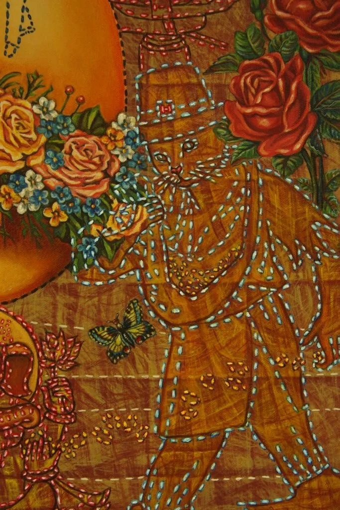 Acrylic on canvas with embroidery, 20″x20″x1.5″, 2017