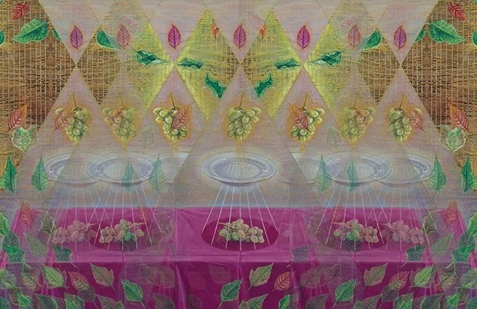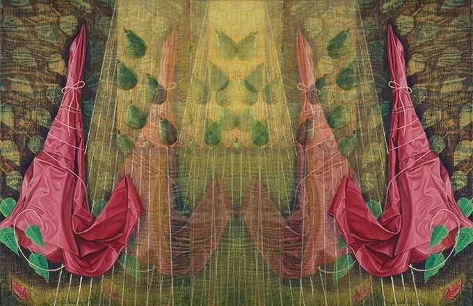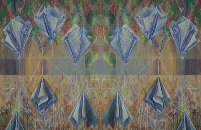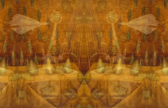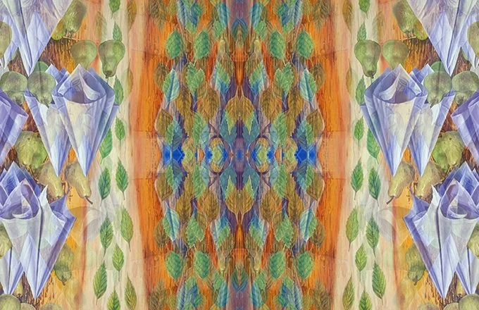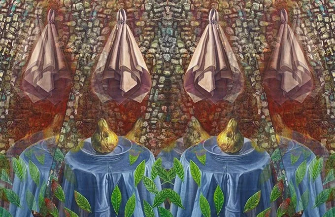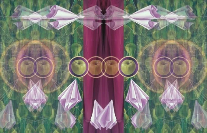 I seek to give my digital compositions a feel of fluctuating space, like the space of a moving piece of cloth—something in a mutable state. Digital technology makes it easy for me to create multiple if not endless reiterations of images and mirror images. Using elements/images from my paintings that allude to Renaissance paintings I construct multiple iterations of these elements and a composition that displays self-similarity and fractal dimensionality. The composition itself moves to become drapery that veils and unfolds interpenetrating space. The fluctuating and enfolding space that cloth inhabits parallels a model of sub-atomic physics, string theory or super-string theory. The idea of fractal geometry and the constant vibration of infinitely many strings has a similarity to French post-structuralist theory in general and Deleuze’s ideas of The Fold in particular “…a virtuality that never stops dividing itself.” Deleuze’s model or “monads” is a series of Becomings where difference creates a universal harmony. So pictorial space, like drapery space, string theory, and post-structuralism all create an infinite folding of becoming, the movement and variation of image and idea. My experiments in digital media revise images from my drapery paintings into landscapes that play with the idea of mise en abyme, “placing into infinity” or “placing into the abyss,” to formally create a fractalized space of endless reflexivity.
