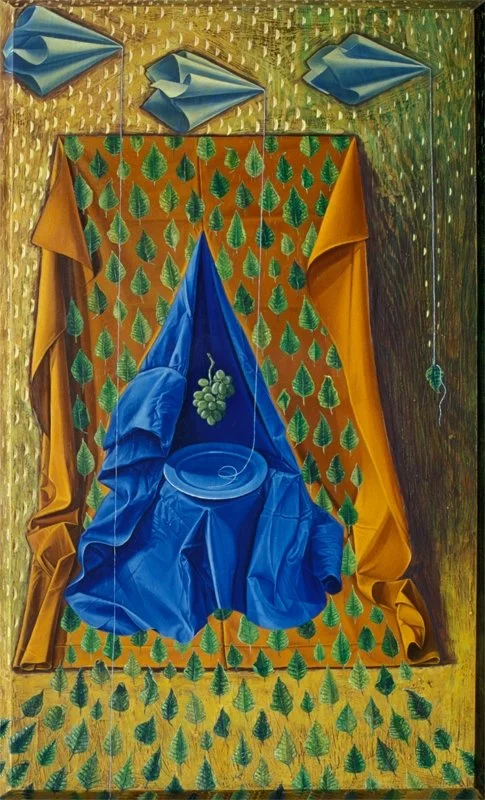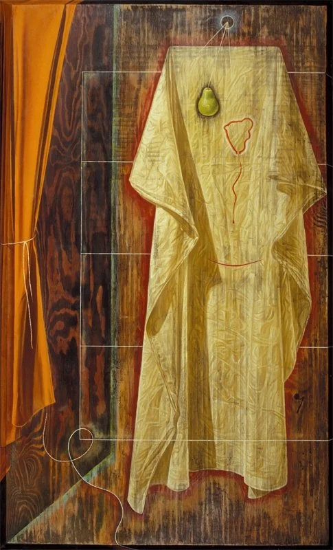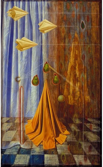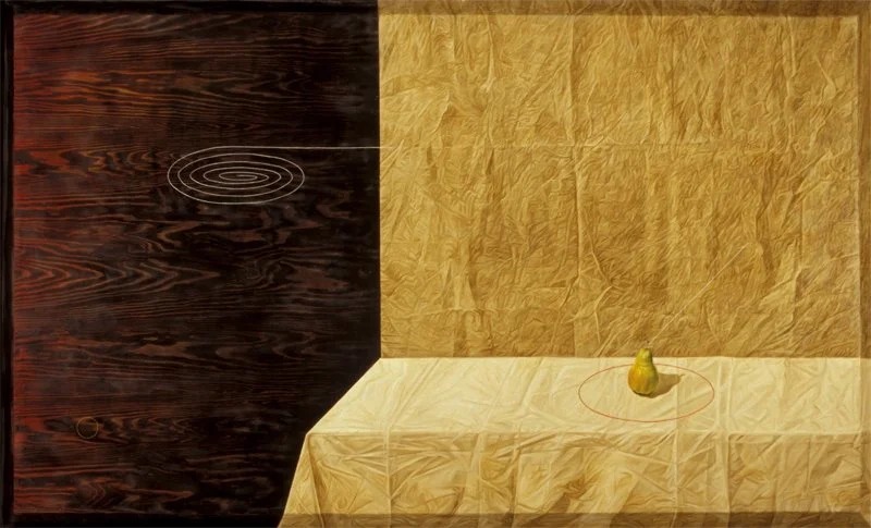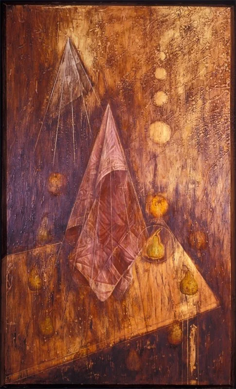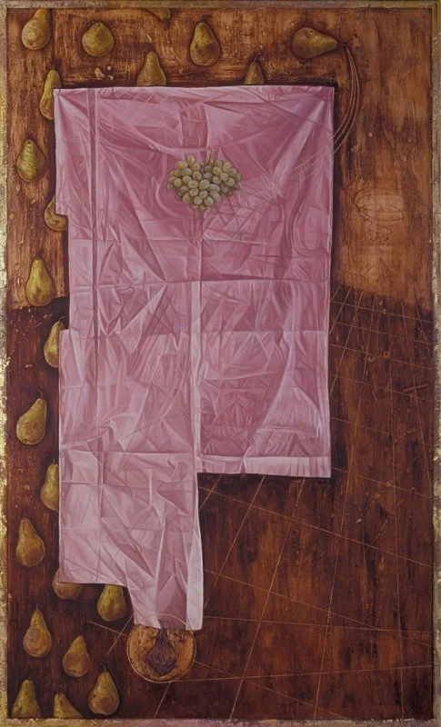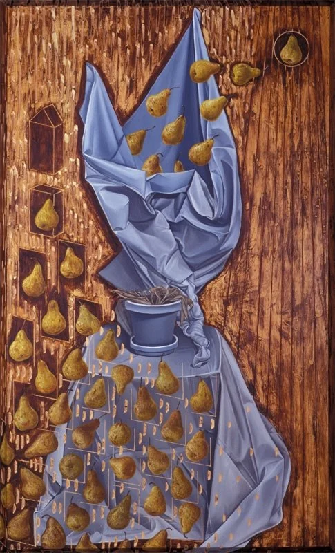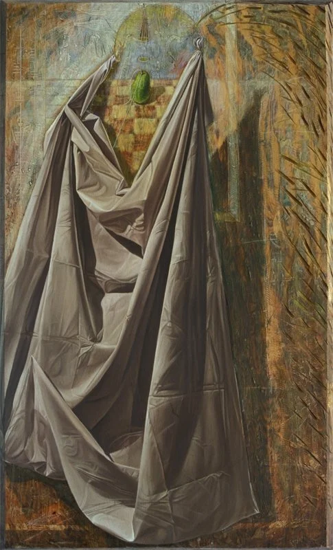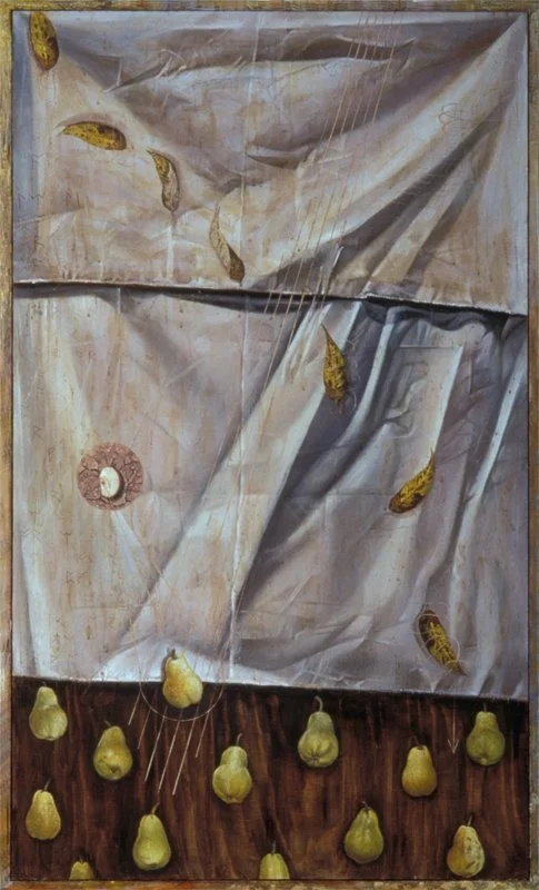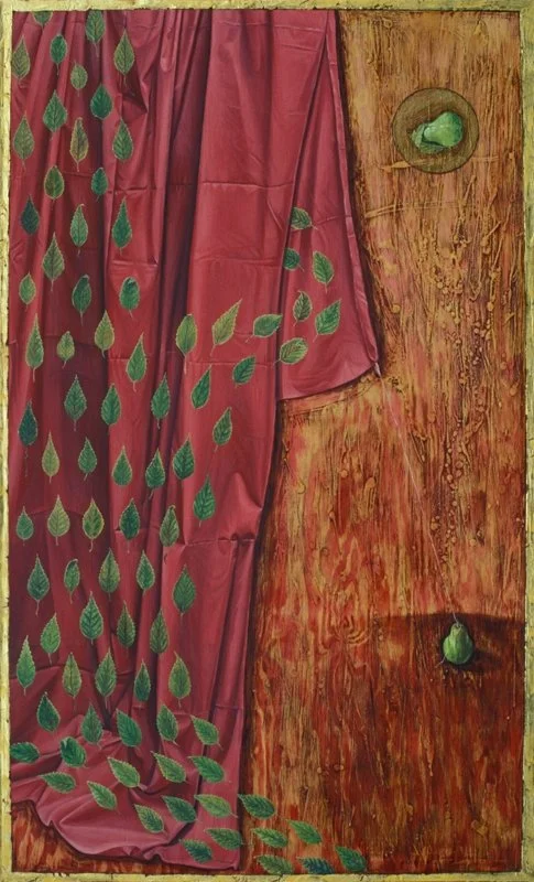 In my paintings, illusionistically painted drapery and fruit substitute for the body, a barrier between interiors (still life objects and references) and exteriors (landscapes, perspective lines, houses, tornadoes), or a boundary where interiors meet exteriors. The drapery embodies substance but also spirit: the point where ideas, people, cultures, and emotions cross and sometimes merge. Drapery connects dynamic with static. Drapery becomes a catalyst for exploring the conflict between belief and deed. Symbols and metaphors continually evolve and recycle in my paintings; drapery on a table top uncovers objects such as a dying potted plant, decaying pear, or tornado, objects that represent death and destruction or a death-defying force, depending on their context.