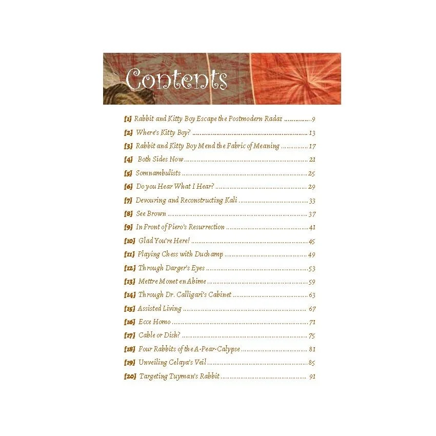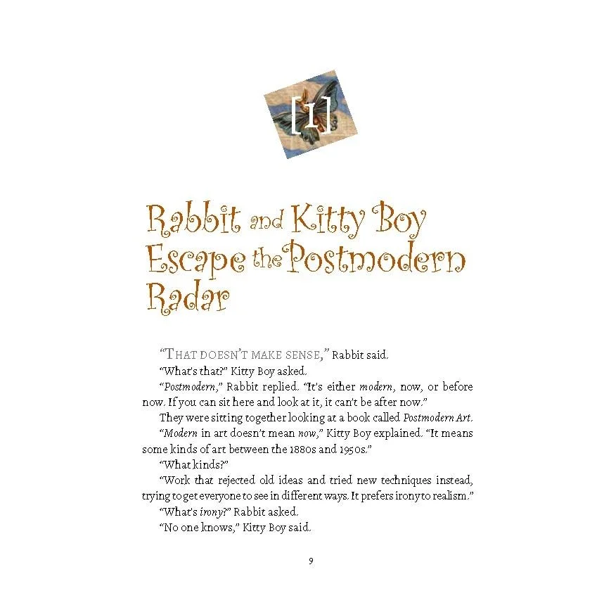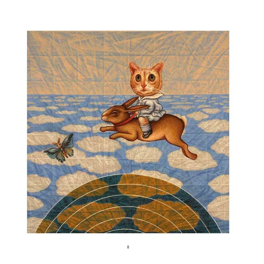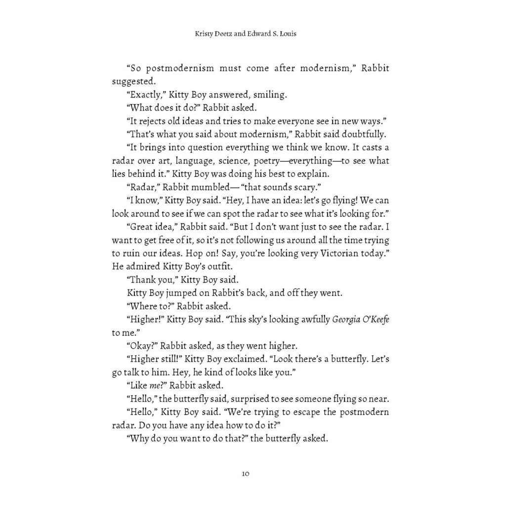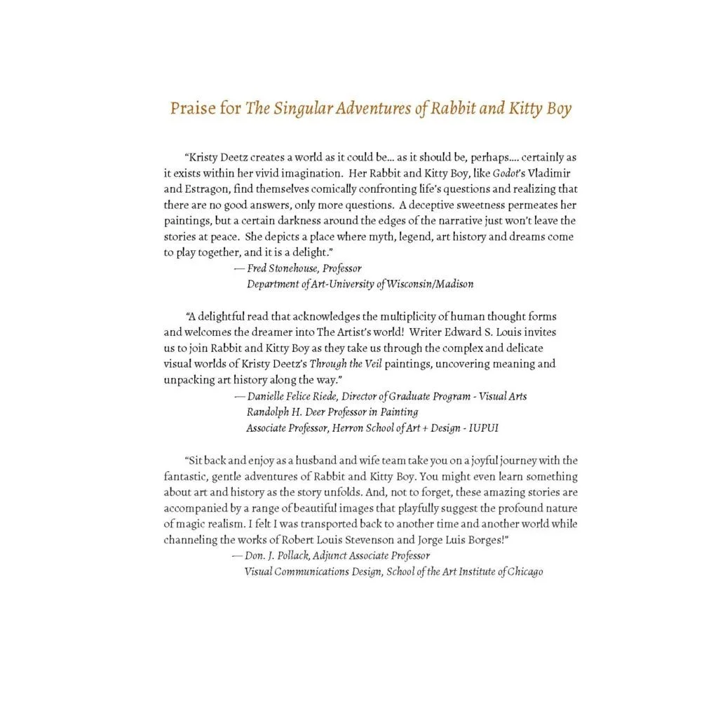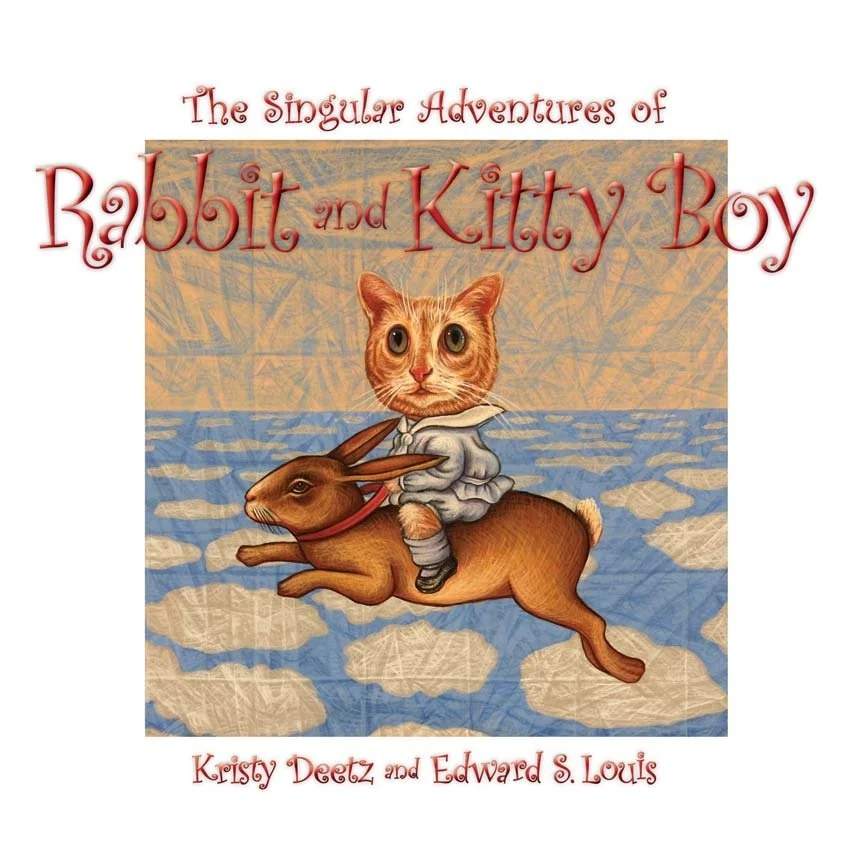 The Singular Adventures of Rabbit and Kitty Boy is an inspired collection of intriguing paintings by Kristy Deetz, accompanied by charming and satirical stories by Edward S. Louis www.edwardslouis.com. Join the shape-shifting Rabbit, along with his best friend and astute sidekick Kitty Boy (both close friends of The Artist) as they venture into a land of visual and linguistic imagination, enthusiastically posing as art critics! Clever conversations between the two characters spark interpretation of the images, connecting with ideas from art history and theory, along with subtly dark humor – and plenty of puns!
